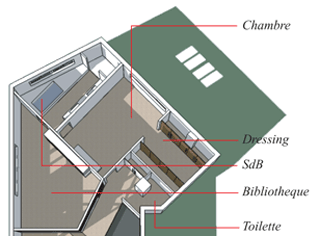 Création d'une chambre, d'une pièce d'eau, d'un dressing, de toilette, d'un bureau, d'un séjour / salle à manger, d'une cuisine.
