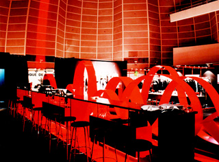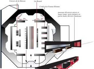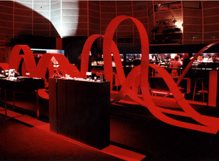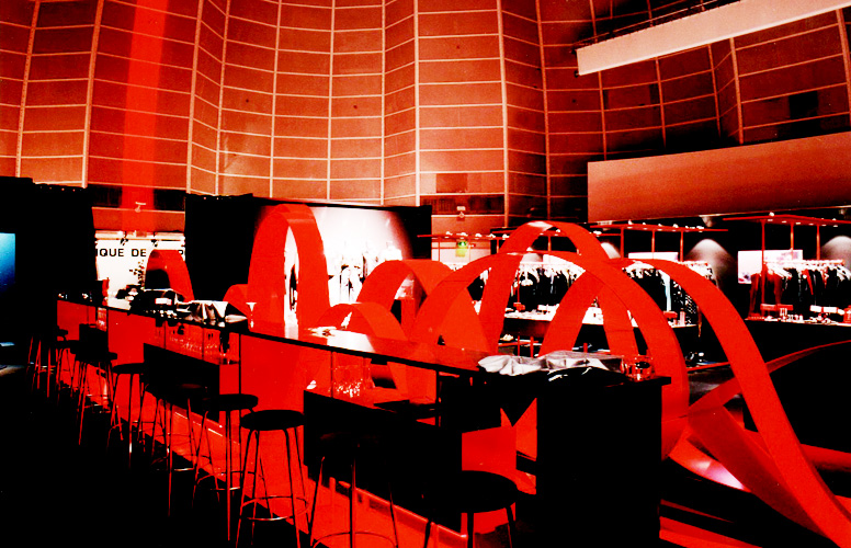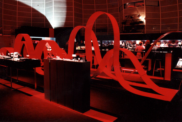 Les différentes vagues du noir seront le point de départ stylisé de la scénographie pour la salle de presse, dédiée au shopping des journalistes.