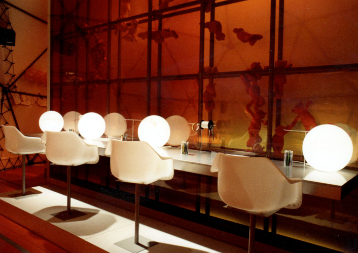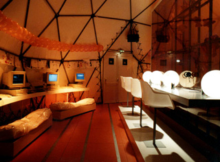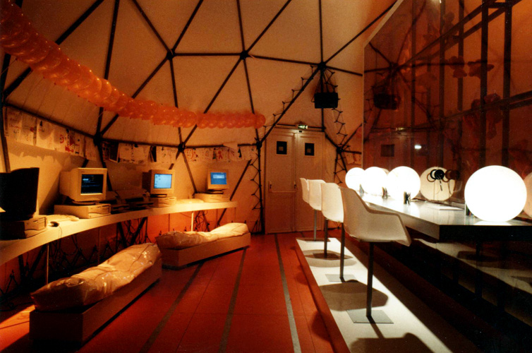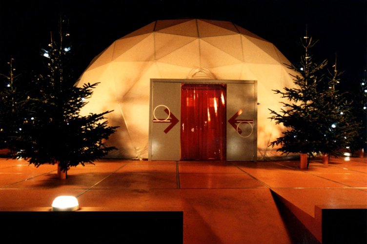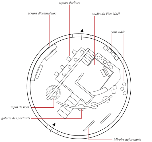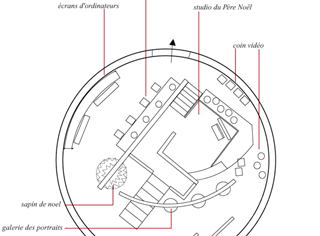 Les enfants viennent à la rencontre du père noël, se font photographier avec lui, regardent un dessin animé, jouent devant des miroirs déformants, recomposent la galerie de portrait de la famille du Père Noël, passent leurs commandes sur ordinateurs et écrivent des messages de voeux qui seront accrochés à des ballons pour un lâcher sur la terrasse lors du passage à l'an 2000.