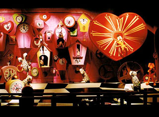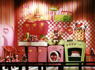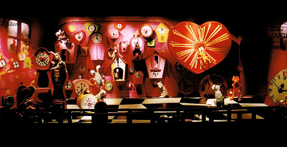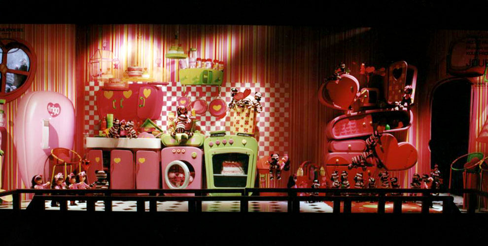 L'Amour est raconté à travers 12 vitrines animées d'une ménagerie de peluches. Ici des chats amoureux de leurs horloges tentent de les réparer, ces dernières folles d'amour ont perdu la tête...